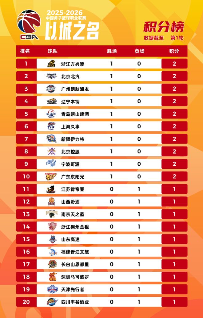 新赛季CBA联赛常规赛已经开打,目前第 一 轮对决全部结束。